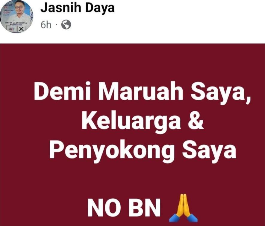 “Demi maruah saya, keluarga & penyokong saya no BN,” katanya dalam satu hantaran di laman sosialnya semalam.