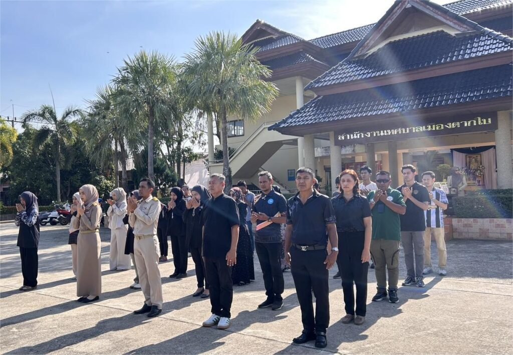 Pegawai dan kakitangan Majlis Perbandaran Tak Bai mengadakan acara menaikkan bendera untuk menzahirkan rasa terima kasih kepada ‘Negara, Agama dan Monarki’ yang kelazimannya diadakan setiap Isnin.